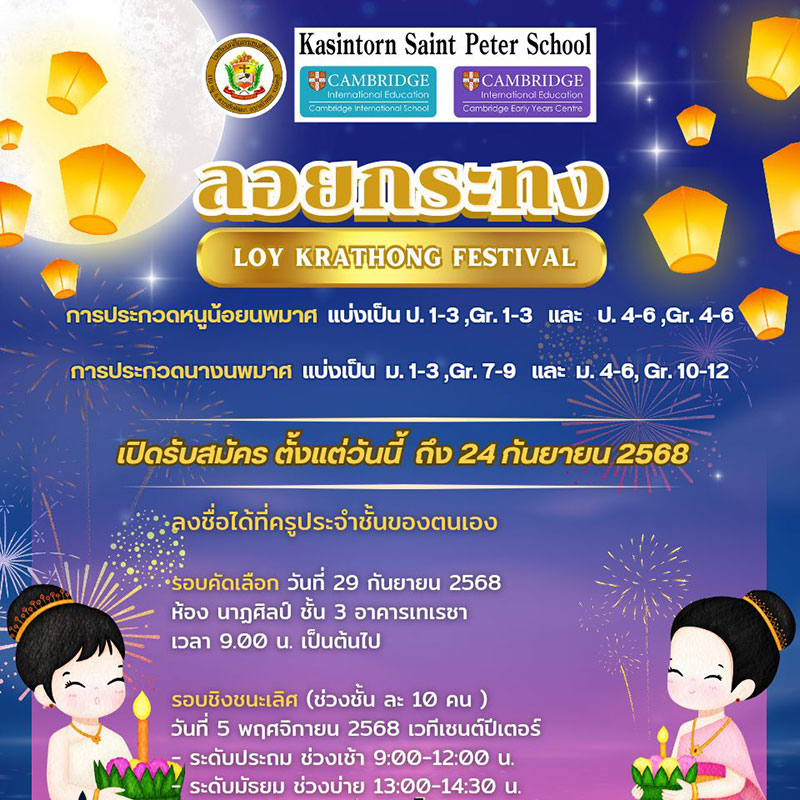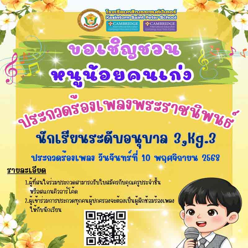 🏫Public Announcement Kasintorn Saint Peter School Invites talented little ones to join the Royal Compositions Singing Contest Kindergarten 3 students (Kg.3)⏰ Singing Contest Schedule Monday, 10 November 2025