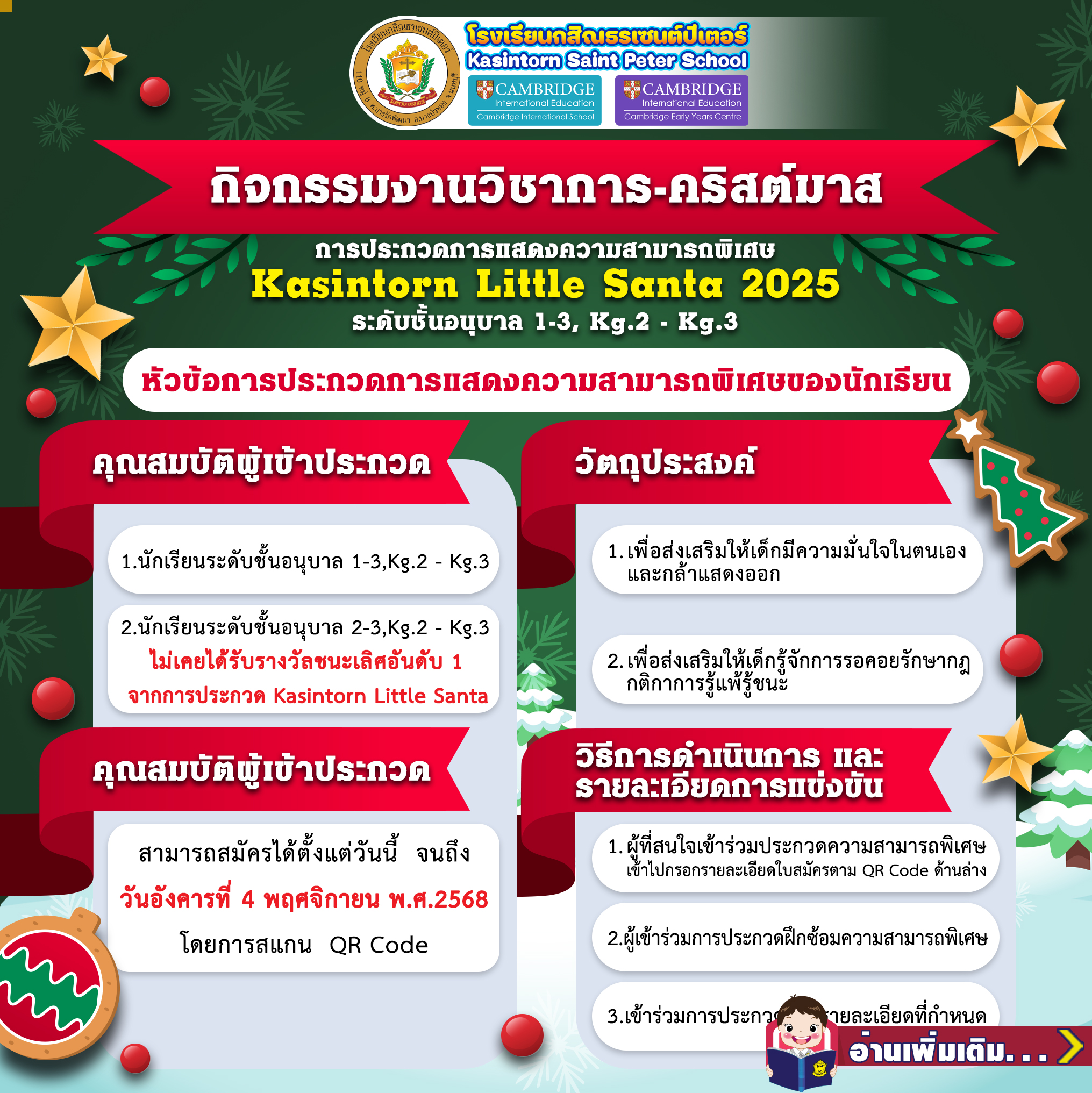 🏫Kasintorn Little Santa 2025 Talent Show Competition. Kindergarten Levels 1-3, Kg.2 - Kg.3 Competition Theme: Talent Show for Students Registration Period: Applications are open from now until Tuesday, November 4, 2025, by scanning the QR code.