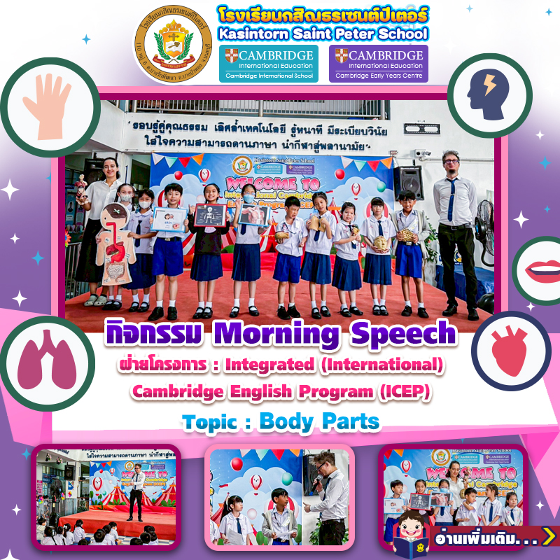 🏫Kasintorn Saint Peter School organized an activity for students in Grades 3/3 and 3/4 with the objective of enhancing their listening and public speaking skills effectively. Teacher Sophie and Teacher Daniel conducted the activity, providing knowledge and encouraging students to communicate in English on the topic "Body Parts."