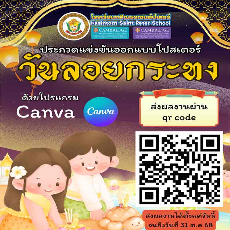 🏫Poster Design Contest: Loy Krathong Theme Create posters using Canva • Secondary (Grades 7–9 / Mathayom 1–3): Theme: “Thai Krathong under the Moonlight”• Secondary (Grades 10–12 / Mathayom 4–6):Theme: “One Krathong, One Hope”Submission Period: From today until 31 October 2025 via QR Code.