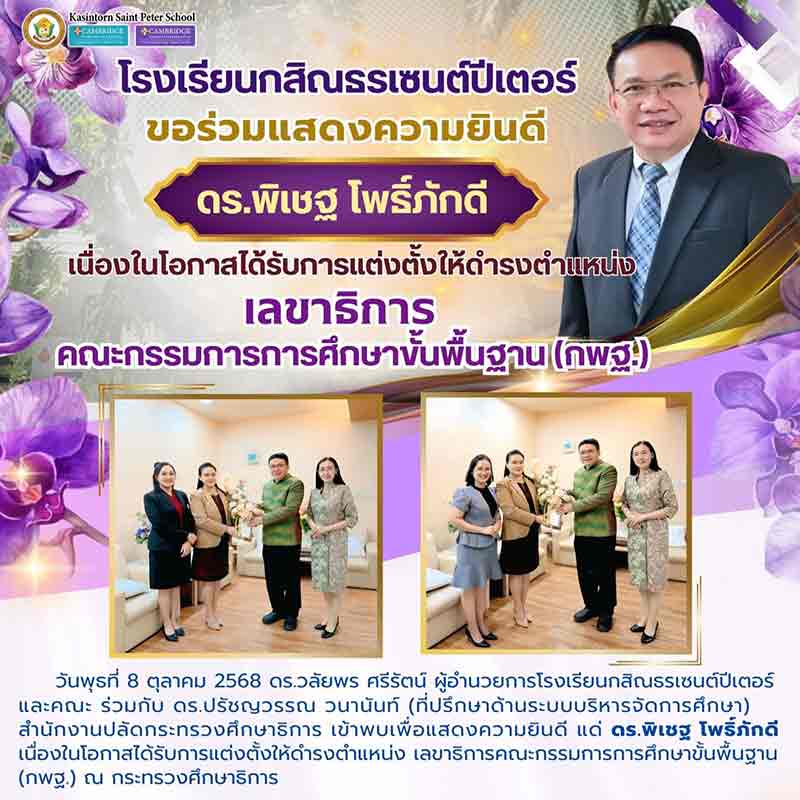 🏫On Wednesday, October 8, 2025, Dr. Walaiporn Sriratana, Director of Kasintorn Saint Peter School, along with her team, and Dr. Pratchayawan Wananan, Educational Management System Advisor to the Office of the Permanent Secretary, Ministry of Education, paid a visit to congratulate Dr. Pichet Phoepakdee on the occasion of his appointment as Secretary-General of the Office of the Basic Education Commission (OBEC) at the Ministry of Education.