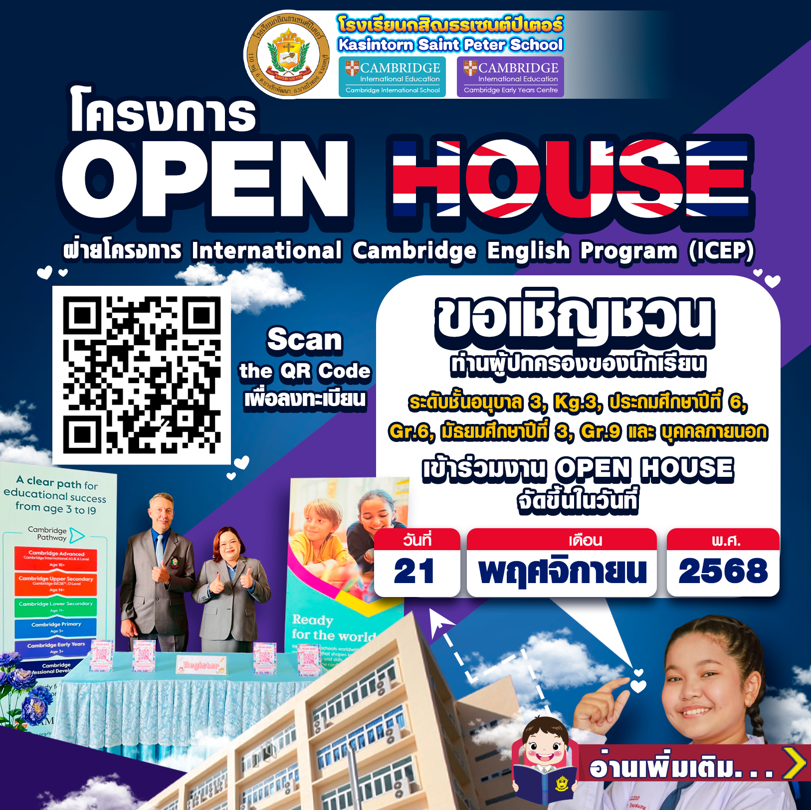 🏫International Cambridge English Program (ICEP) We invite parents of Kindergarten 1, Kindergarten 3, KG.3, Grade 6, and Grade 9 students, as well as the general public, to join our Open House event at the Saint James Hall and Saint Jocobe’s Building.Date: November 21, 2025 at 08.30 - 12.00.Note: You may scan the QR Code to register.
