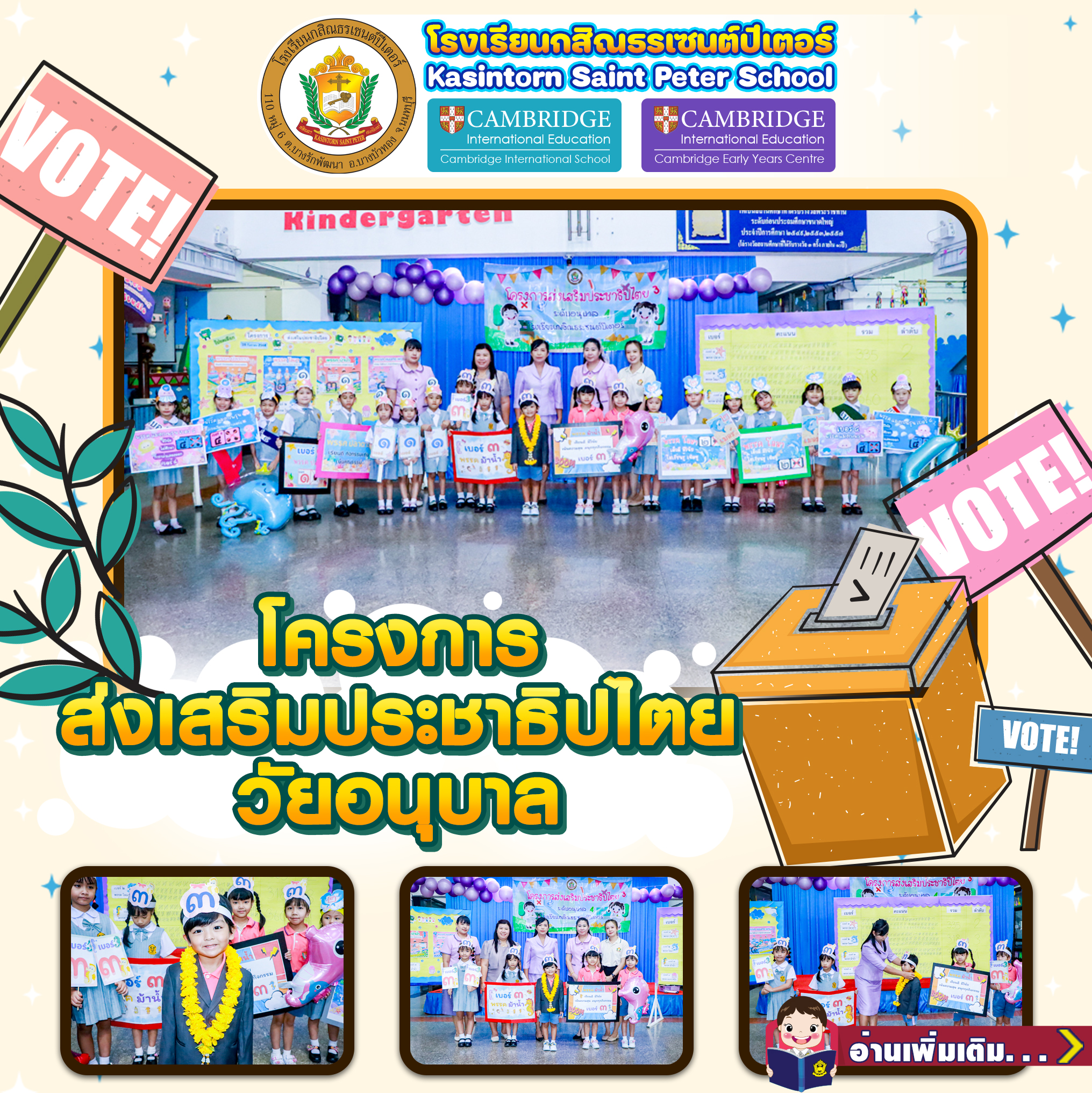 🏫Kasintorn Saint Peter School, Kindergarten Department, has organized the Kindergarten Democracy Promotion Project to encourage young children to learn about democratic ways of life through various activities. These include practicing how to be good leaders and followers, working together with others reasonably, making sacrifices for the common good, respecting others’ opinions, and cultivating morality and ethics.